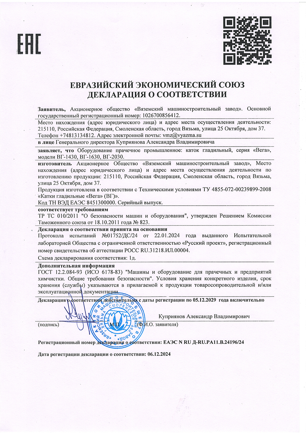 Гладильный каток ВГ-1430 имеет пружинную обмотку вала Springpress, которая позволяет равномерно прижимать белье к гладильному желобу по всей его поверхности, сглаживая возможные неровности. В том числе это актуально для тканей, имеющих утолщения на швах, пуговицы и т.д. Обмотку Springpress используют в конструкции своих гладильных катков более 85% ведущих мировых производителей, что свидетельствует о признании эффективности данного способа улучшения качества глажения. Качество глажения на гладильных катках Вязьма ВГ-1430, благодаря применению данной технологии, соответствует лучшим мировым показателям.