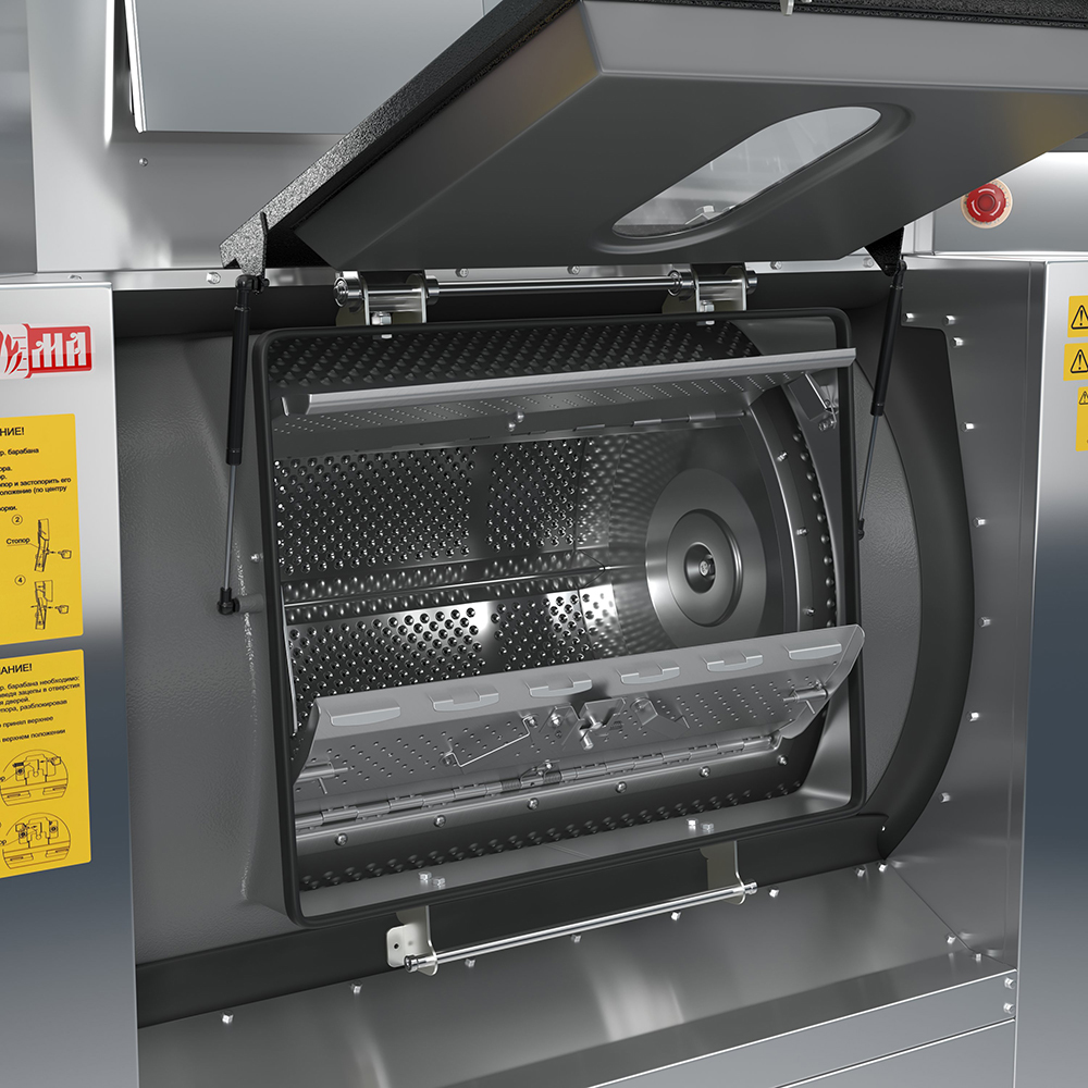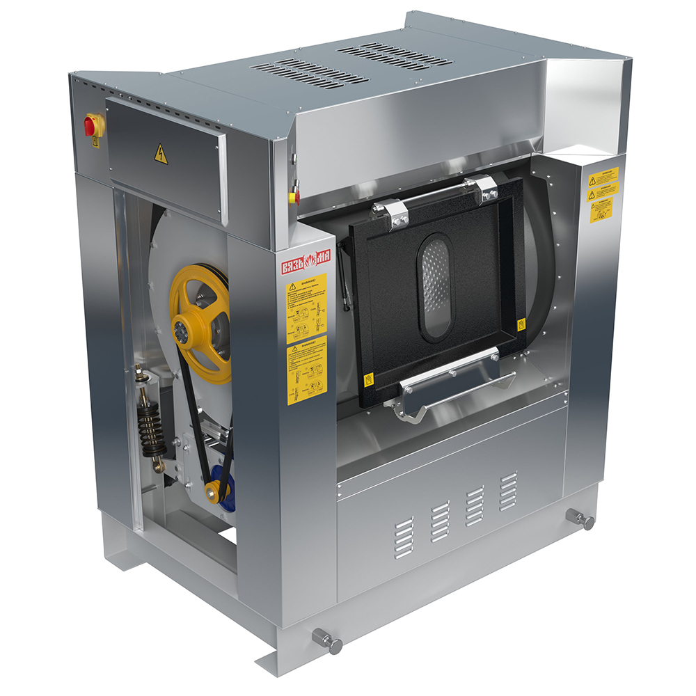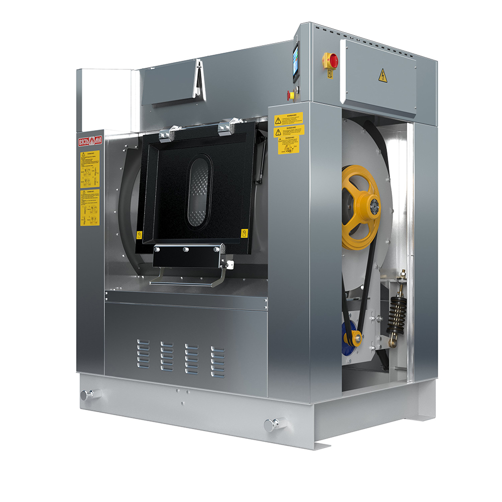 Конструкция машин предусматривает загрузку и выгрузку белья из разных зон (в помещениях, разделенных стеной) с целью соблюдения санитарно-гигиенических норм чистого белья в медицинских учреждениях или в учреждениях атомной, химической, электронной промышленности и других отраслях.