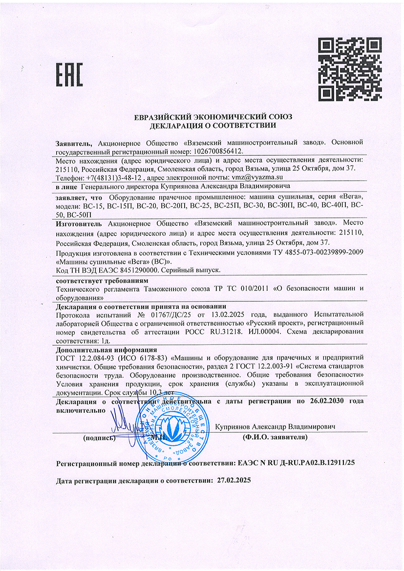 Сушильные машины «Вязьма» серии «Вега» предназначены для сушки белья из смешанных и хлопчатобумажных тканей, отжатого до 50% влажности. Сушильные машины выпускаются в полной комплектации и имеют следующие опции: